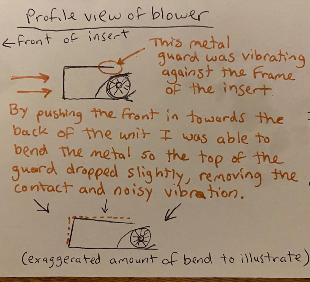 After installing the Matrix (which is beautiful) we were absolutely shocked to hear how loud the blower was. It had a terrible vibrating hum coming from it. After researching forums online, several folks reported similar issues and narrowed it down to the blowers being notoriously loud and said to buy a aftermarket blower or to basically just deal with it. I removed the blower assembly to inspect it and all the moving parts were solid and smooth, so it didn’t make sense that it was the fan itself. After tinkering a bit, I found that the bottom sheet of metal on the insert was vibrating against the brick of the fireplace floor. I managed to diagonally drill a hole through the metal behind the lower faceplate and sink a tapcon screw into the brick to hold it down. That helped a little bit but the noise was still mostly there. It turned out that the metal shroud/guard at the front of the blower assembly was contacting the frame of the insert and was vibrating like crazy. I figured this out when I was pushing on the blower while it was running and the noise would go away. In the end I pushed on the front of the blower shroud firmly enough that it bent, forcing the vibrating part down just slightly which removed the contact from the insert frame. (See sketch in the photos) Now the blower is so much quieter. We can easily watch tv or have a conversation, whereas before we had to blast the tv or scream to hear the other person over the obnoxious hum.
